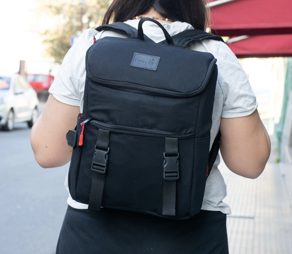 Espacio externo: Cintas frontales para sujetar camperas y/o objetos. Tiene dos bolsillos laterales, uno con cierre. Posee portanotebook.
